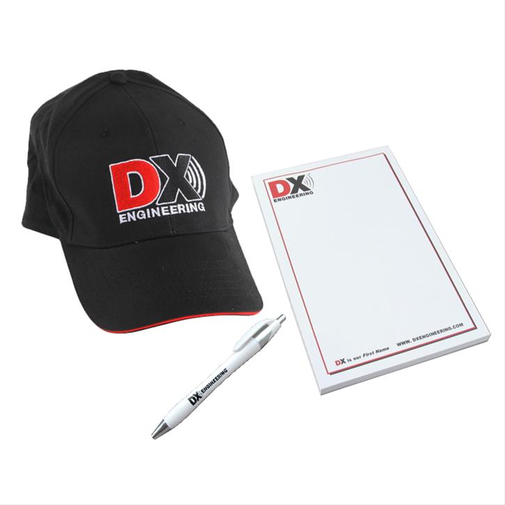 Hat, notebook, and pen in one package, all branded DX Engineering. The notebook goes in the shack. The pen goes in their pocket. The hat goes on their head. All three are genuinely useful. |